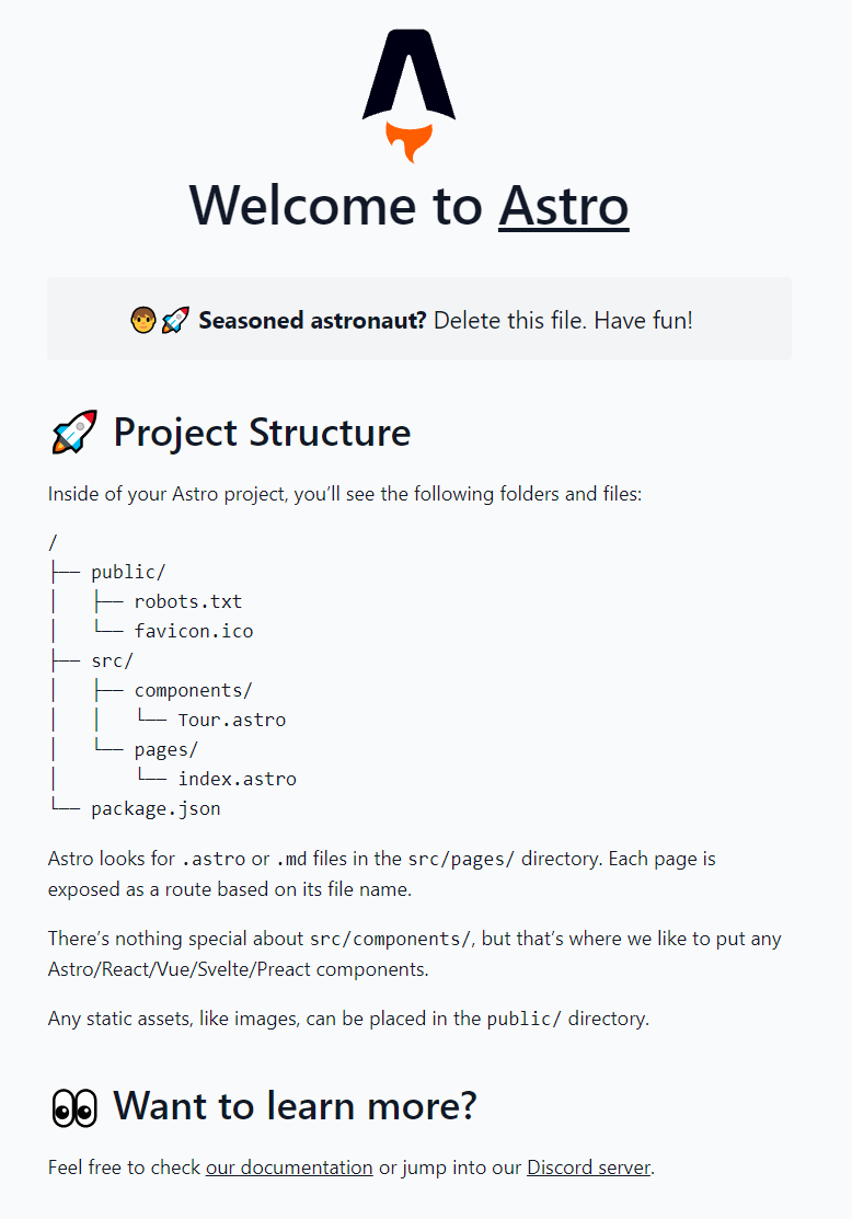 You then need to install the dependencies of the selected ecosystem you chose in the previous step, npm i and run the project with npm run dev. If you open up http://localhost:3000/, you should see the Welcome To Astro screen similar to the below: