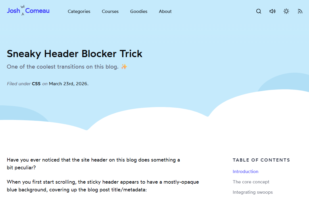 --inspect flag when using next start so that you can attach a Node.js debugger to production builds.transitionTypes prop, which is an array of strings that specifies the types of View Transitions to apply when Navigating. This extends support for View Transitions in Next.js websites.This week, Josh Comeau gives us an insight into how he created his very cool sticky header effect on his blog, and it turns out that it's a lot simpler than you would expect.